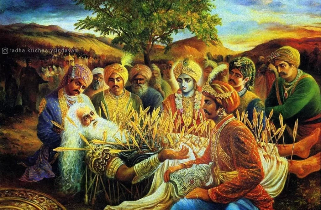 Dans un autre arrangement inconcevable du destin, Bhīṣma, le bienfaiteur des Pāṇḍavas (les cinq fils de Pāṇḍu – dont Yudhiṣṭhira était l’aîné), se retrouva dans le camp adverse. Bien que son affinité envers Kṛṣṇa et les Pāṇḍavas était bien connue, il dût toutefois les affronter, parce qu’il y a longtemps de cela, dans le but de faire plaisir à son père, il avait fait le vœu de rester fidèle à quiconque occuperait le trône de Hastināpur.